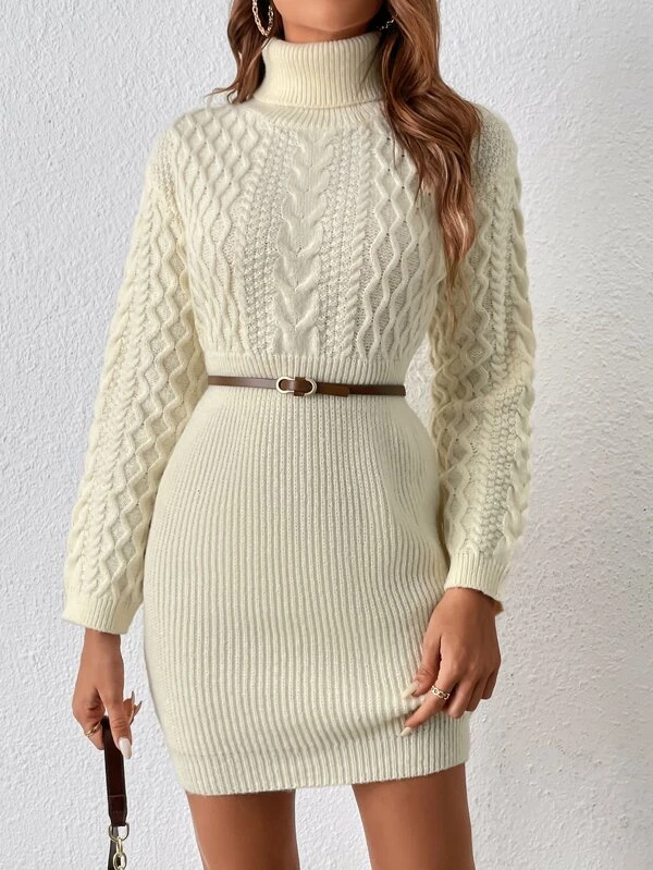 Turtleneck Cable Knit Drop Shoulder Sweater Dress Without Belt